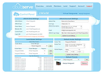Each different style Gateway has a control panel to match its base use.  vLand offers a control to load and backup OARs, restart a region and customize  hypergrid URL address.  The vGateway offers more control panel options such as load and back up OARs, load and backup IARs, restart region, and customize hypergrid URL.  The vWorld control panel is expansive in all it offers with default and premium avatar choices, default landing site desired by grid owner, avatar management, integrated money system, account specifics, transaction history, change grid username/password, and many other useful features.  Control panels are created to afford all grid owners of any type Vgrid to have the tools to manage their grid in their own personalized way.